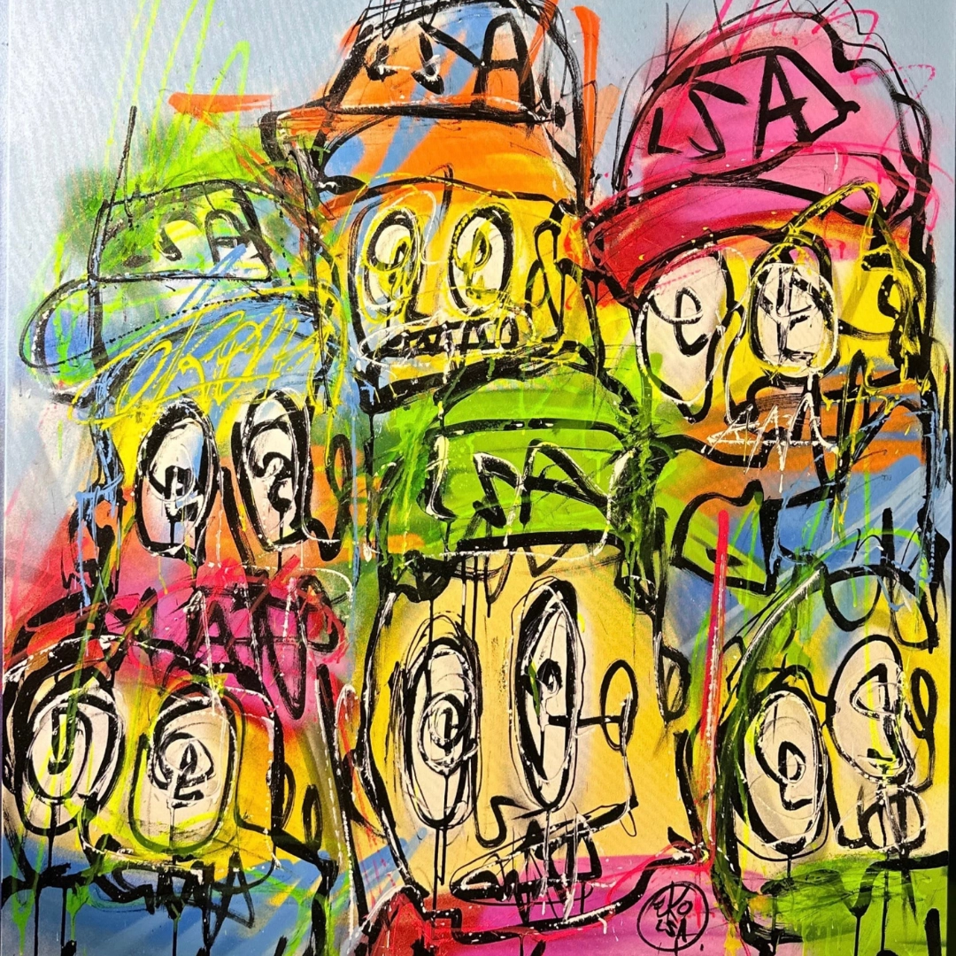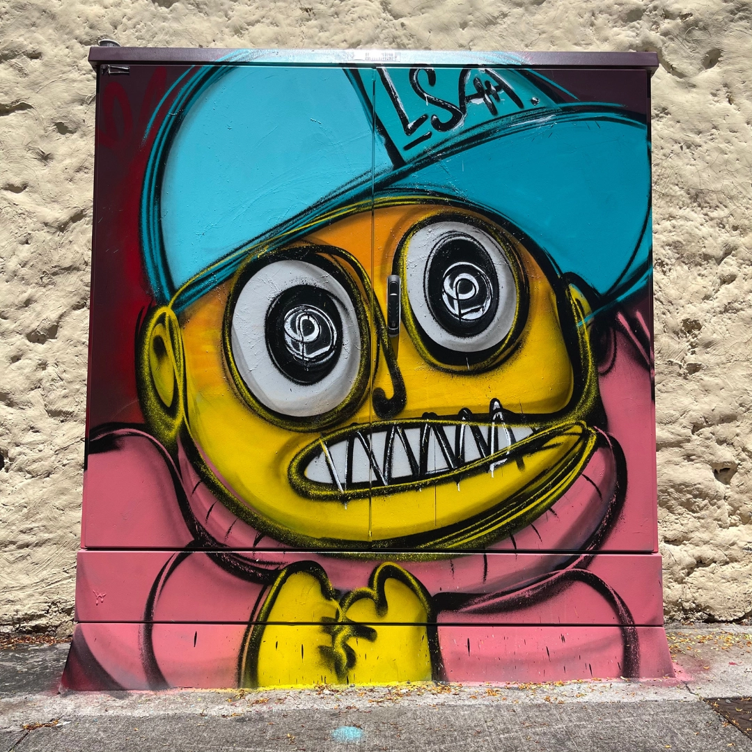 Les B-boys d’Eko LSA sont des visages stylisés issus de la culture graffiti. Dans le milieu du street art, un « B-boy » désigne souvent un personnage dessiné aux côtés des lettrages. Eko a transformé ces figures en une signature artistique forte, reconnaissable par leurs couleurs vives, leurs traits fluides et leur regard orné du symbole Eurobase : un « e » dans un cercle, à mi-chemin entre une pièce de monnaie, un œil et une signature numérique.
